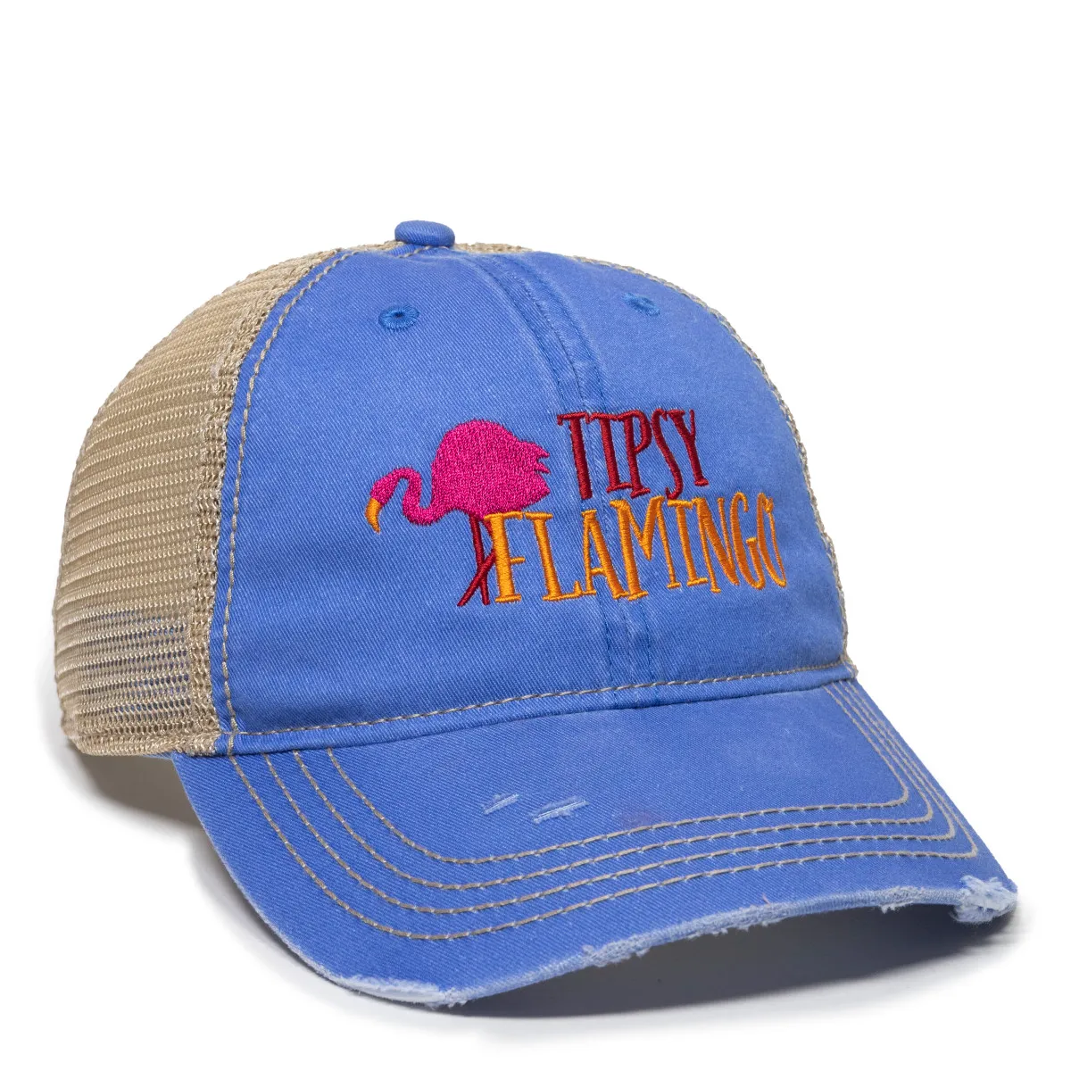 Low Crown ,Mesh Back,Weathered Cotton Front Panels,Mesh Back Panels,Pre-Curved Frayed Visor,Structured,Hook/Loop Tape Closure,Contrast Heavy Decorative Stitch